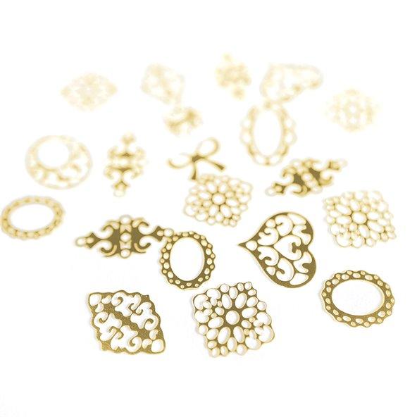 Dès le premier regard, les formes captivent. Médaillons ajourés, cadres ovales, arabesques délicates, nœuds élégants, cœurs ouvragés ou motifs floraux finement ciselés : chaque élément évoque un style baroque chic, à la fois romantique et intemporel. Le coloris gold vintage, légèrement patiné visuellement, évite l’effet trop clinquant pour offrir une brillance élégante, subtile et parfaitement maîtrisée.