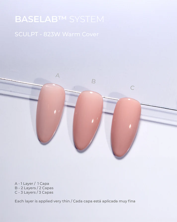 BaseLab™ Sculpt Warm Cover (#823W) : base de construction nude chaud couvrant idéale pour extensions et camouflage de l’ongle. Viscosité maîtrisée, sans TPO ni HEMA, parfaite pour structurer et unifier en une seule étape. Résultat naturel, homogène et durable.