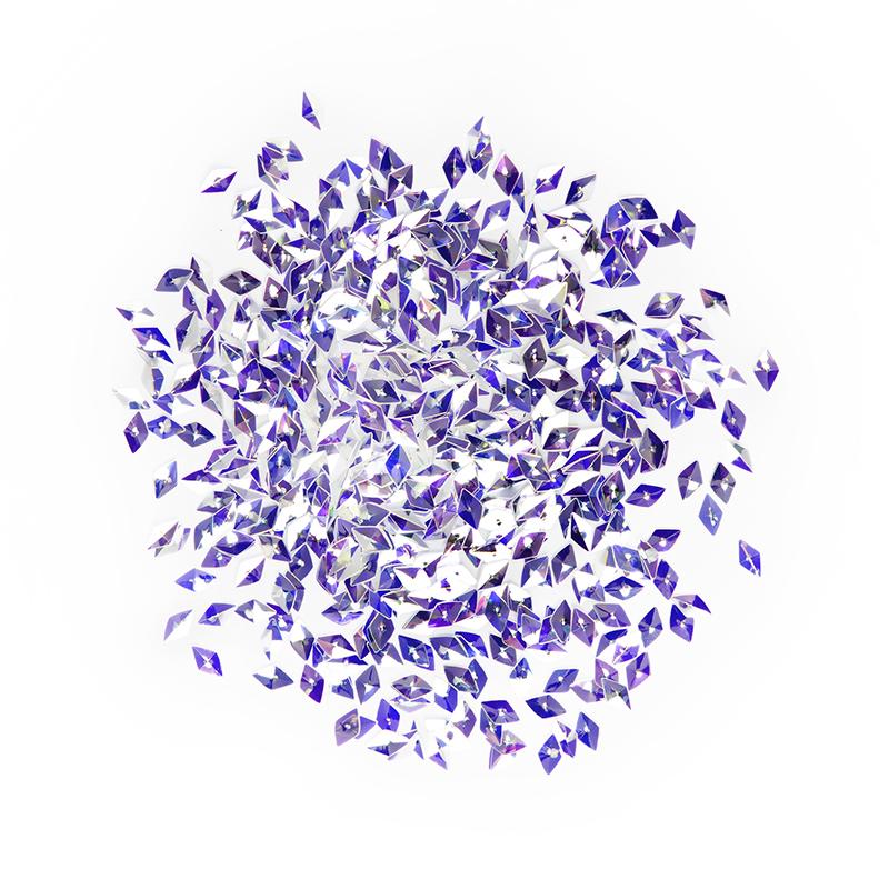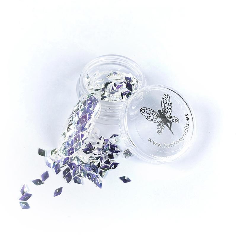 Ces petits losanges ultra-facettés affichent une base blanche opalescente, sublimée d’un effet AB (Aurora Borealis) qui diffuse des nuances lilas, argentées et légèrement bleutées selon l’angle de la lumière. Résultat : chaque ongle capte l’éclat comme un prisme miniature. À porter sur une pose nude, babyboomer, opaque ou transparente… c’est toujours merveilleux.