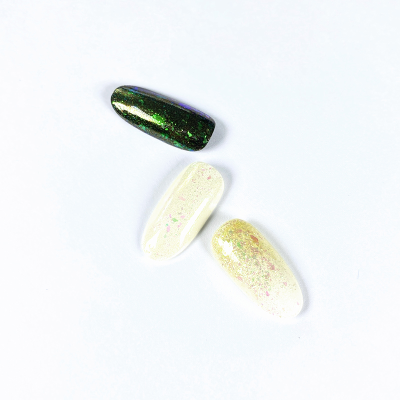 Sur une base claire ou laiteuse, les flakes révèlent un or doux, lumineux et nacré, parfait pour des manucures élégantes, mariées ou naturelles chic.