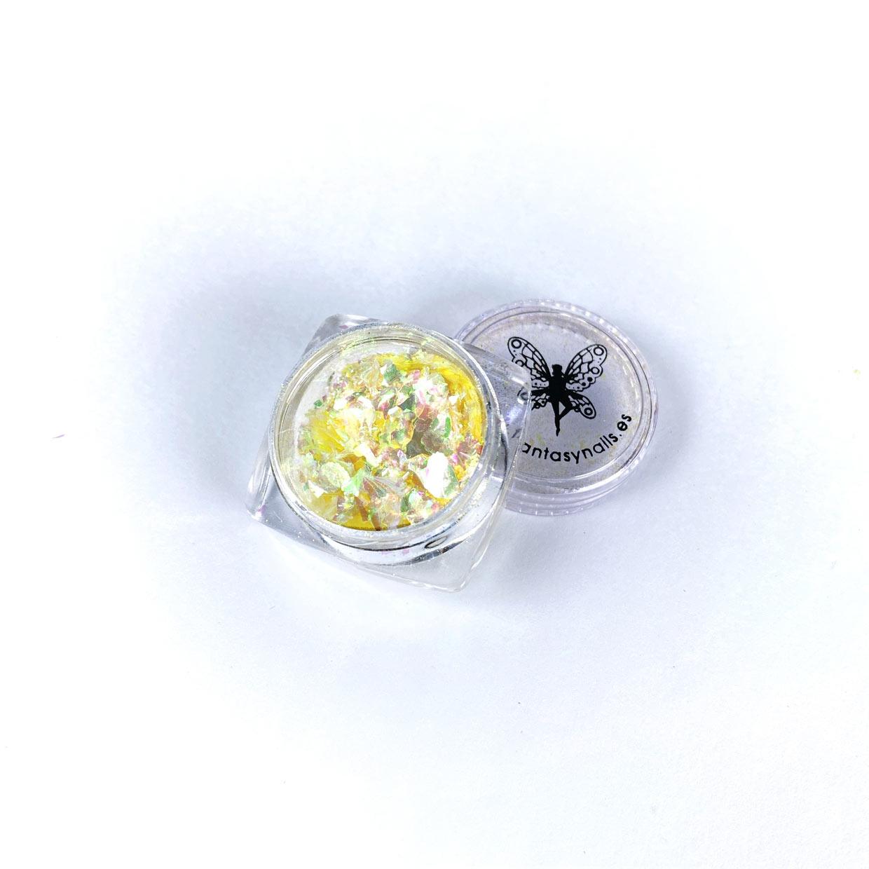 Contrairement aux paillettes classiques, les Mermaid Flakes Gold ne sont ni rigides ni uniformes. Leur structure en micro-écailles permet une application fluide et modulable. On peut les déposer délicatement pour un effet diffus et délicat, ou les concentrer pour un rendu plus intense et spectaculaire. Elles se fondent parfaitement dans la matière, sans créer d’épaisseur excessive ni de surcharges visuelles.