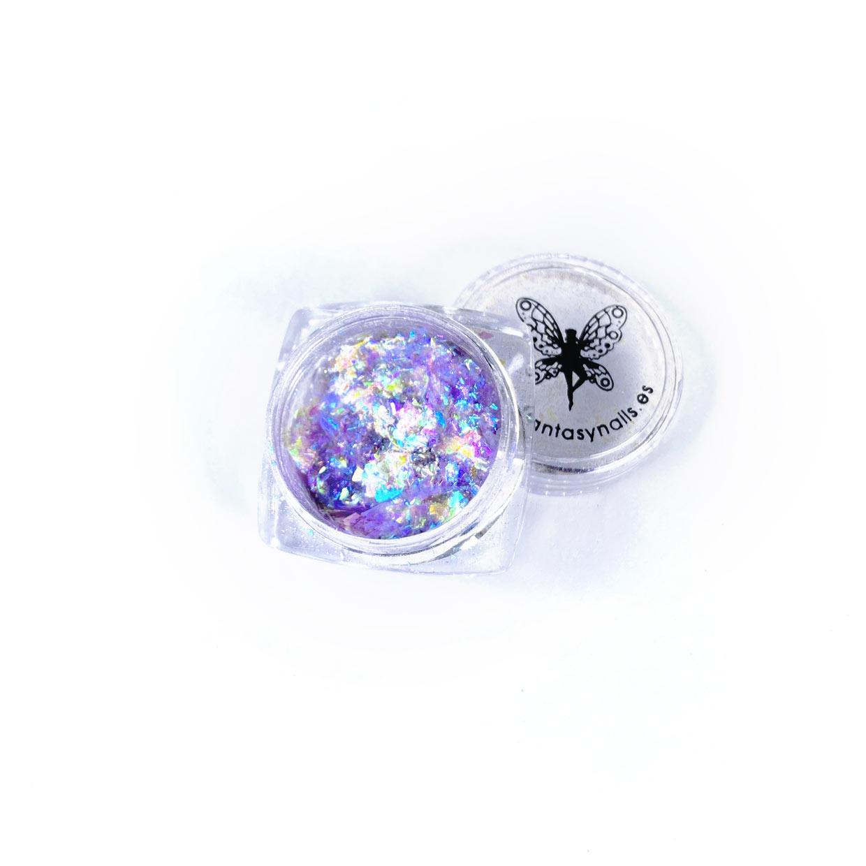 Dès l’ouverture du pot, on découvre des flakes ultra-fins, légers comme des pétales, aux reflets violet, lilas, rose, bleu et nacré. Leur particularité ? Ils captent la lumière sous tous les angles et la renvoient différemment selon la base choisie, la quantité appliquée et la finition utilisée. Chaque ongle devient unique, impossible à reproduire à l’identique… et c’est exactement ce qui fait leur charme. ✨
